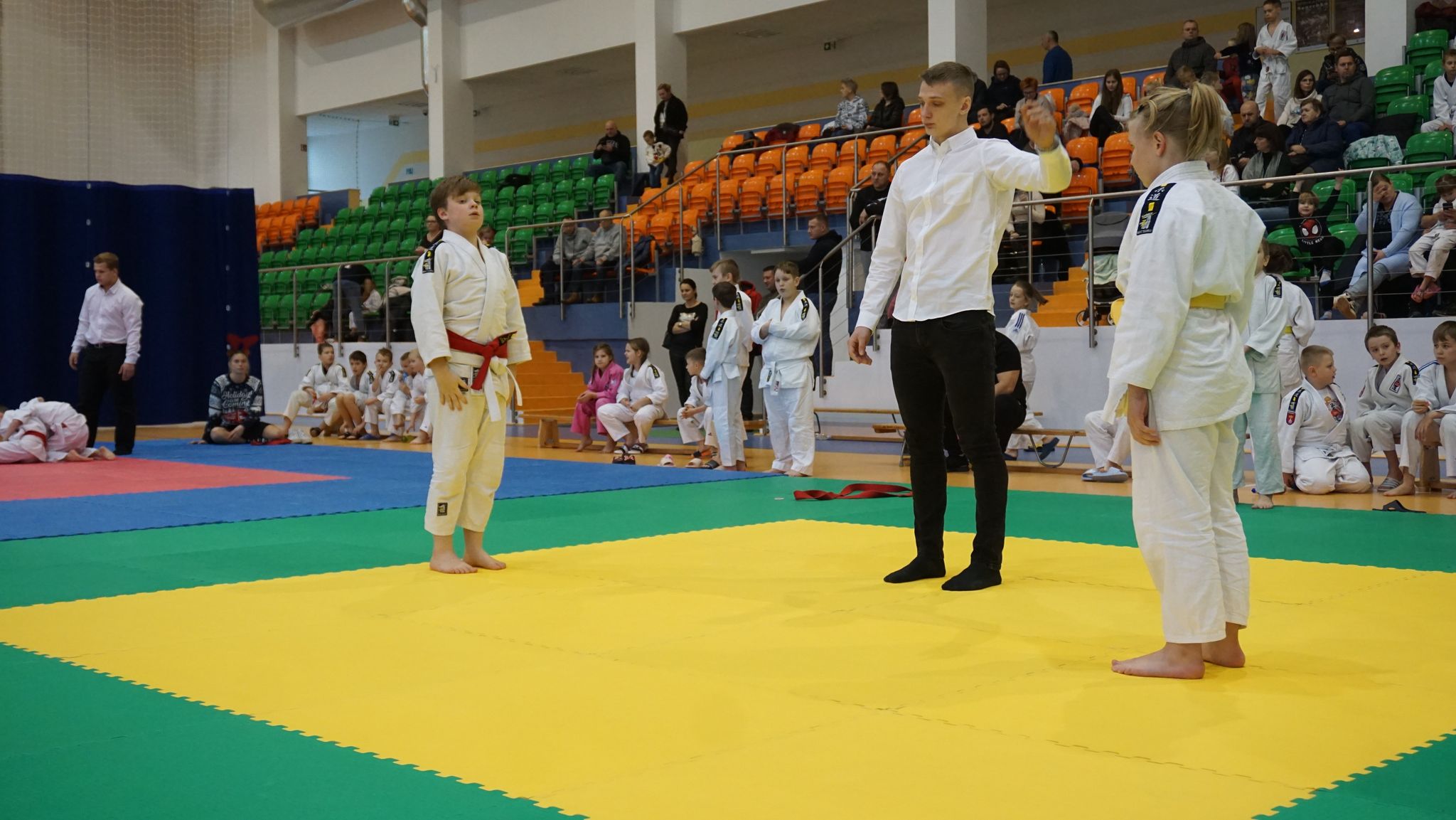 W międzyczasie odbyło się losowanie prezentów: plecaki, worki, bidony. Po skończonych zmaganiach na tatami na dzieci czekała zabawa na dmuchańcu ![]()